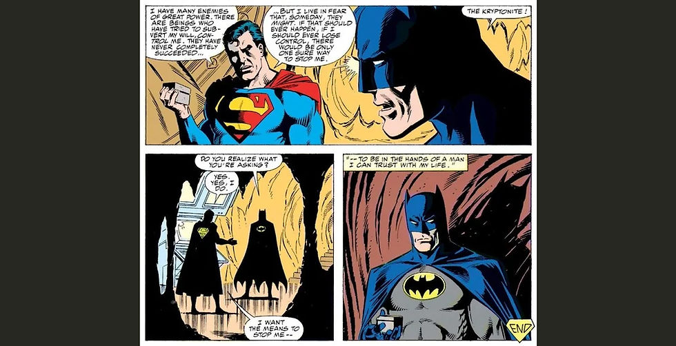 And so, to compensate for this, he throws himself into his work, redoubling his efforts to serve as Earth’s protector. Fighting every threat, answering every cry for help … laboring ceaselessly with little thought for rest or his own state of mind but, as strong as he is, even a Superman has his limits. As insurance, he goes to Batman and, assuming that he doesn’t already have some, offers him a piece of kryptonite to use should he ever lose control again (such as he did in the above scene from Action Comics #654 [June 1990]). As time passes, the fear, the stress, and the constant physical exertion takes a toll on his appearance—as James Tucker said in a now-deleted October 2021 post on X (formerly Twitter), “I always justified [his added facial lines] later by saying Superman was still feeling the aftermath of ‘Legacy,’ where Darkseid brainwashed him into conquering Earth, and the stress of having to prove himself to the world all over again wore him down until the Justice League formed” (qtd. in “What’s”)—and, in time, these factors also affect his physical prowess.